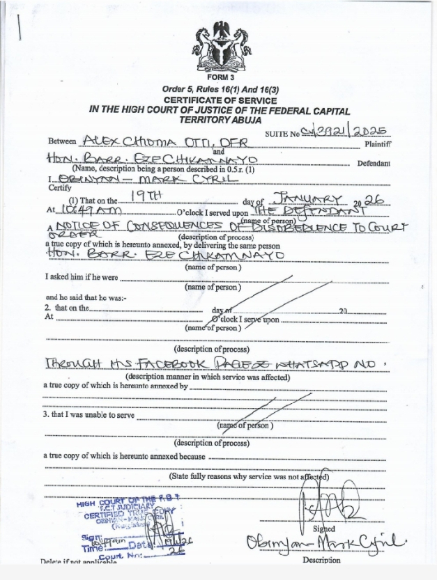 It all began, when, in the course of the substantive matter, Dr. Sonny Ajala, SAN, informed the court that he has a pending Motion Ex-Parte filed on January 12, 2026, asking the court to direct the Registrar of the court to issue Form 87 (notice of consequence of disobedience of court order) against the Defendant.