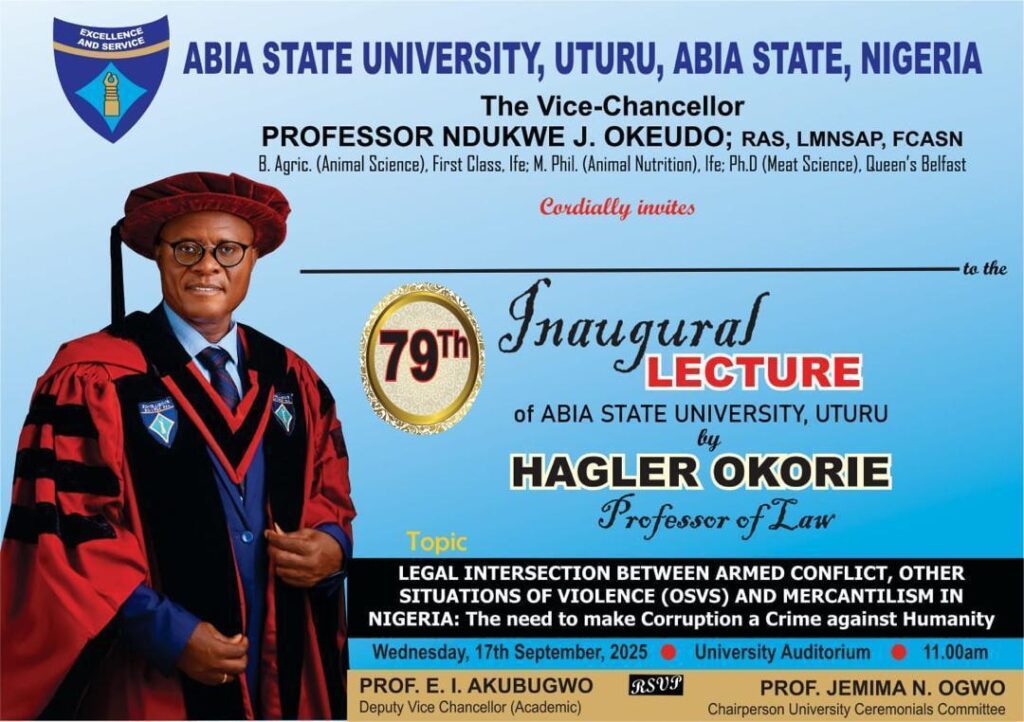 All is set for Professor Hagler Okorie, a Professor of Law, to present the 79th Inaugural Lecture of Abia State University, Uturu, today, 17th September 2025.